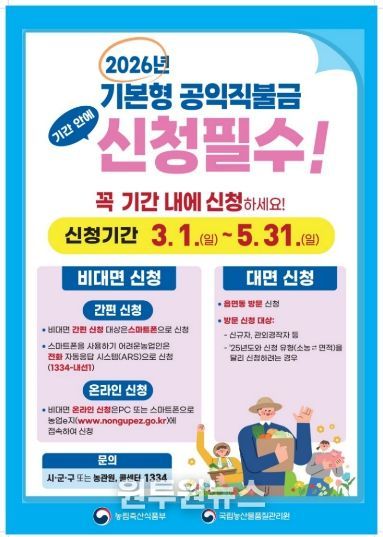(원투원뉴스) 인천광역시 계양구는 2026년도 기본형 공익직불금 등록 신청을 오는 3월 1일부터 5월 31일까지 접수한다고 밝혔다.