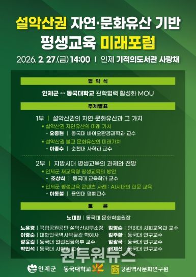 한편, 협약식과 함께 2025년 인제군–동국대 협력사업의 일환으로 '설악산권 자연·문화유산 기반 평생교육 미래포럼'이 개최된다.