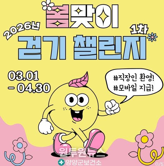 (원투원뉴스) 양양군보건소가 오는 3월 1일부터 주민 건강 증진을 위한 ‘2026년 고맙다 양양 걷기 챌린지’를 본격 운영한다.