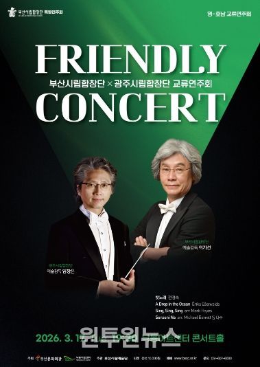 (원투원뉴스) 부산시립합창단(예술감독 이기선)은 오는 3월 17일 오후 7시 30분, 낙동아트센터 콘서트홀에서 '부산-광주시립합창단 교류연주회 프렌들리 콘서트(Friendly Concert)'를 개최한다.