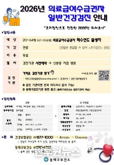 (원투원뉴스) 부산 동래구는 의료취약계층의의 질환을 조기에 발견하고 건강 증진을 도모하기 위해 ‘의료급여 수급권자 일반건강검진’ 수검을 적극 독려하고 있다고 밝혔다.