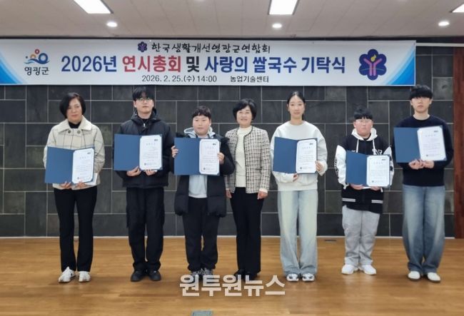 (원투원뉴스) 한국생활개선영광군연합회(회장 원순자)와 영광군농업기술센터(소장 정재욱)는 지난 25일 영광군농업기술센터에서 새해맞이 연시총회를 개최하며 사랑의 쌀국수 44박스(100만원 상당)과 관내 우수학생 6명에게 장학금을 전달했다.