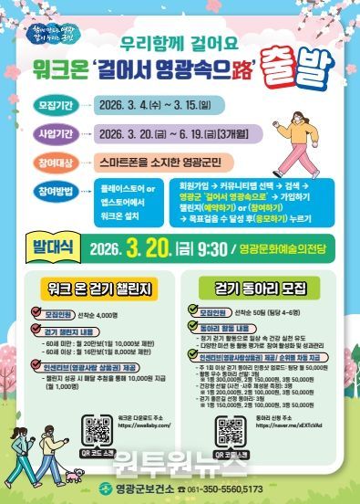 (원투원뉴스) 영광군은 군민들의 신체활동을 장려하고 비만 예방 및 만성질환을 관리하기 위해 모바일 걷기 앱 '워크온(Walk On)'의 모바일 커뮤니티 '걸어서 영광속으路’참여자 및 걷기 동아리를 3월 4일부터 3월 15일까지 모집한다고 밝혔다.