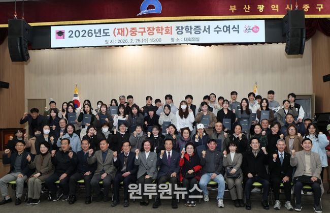 (원투원뉴스) 재단법인 중구장학회(이사장 김현진)는 지난 25일 중구청 대회의실에서‘2026년도 장학증서 수여식’을 개최했다.