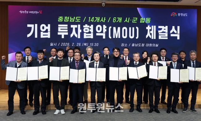 김태흠 지사는 26일 도청 대회의실에서 김석필 천안시장 권한대행 등 6개 시군 단체장 또는 부단체장, 이동주 성창오토텍 대표이사 등 14개 기업 대표와 투자협약을 체결했다.