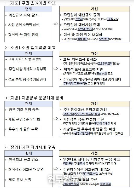 행정안전부는 주민참여예산제도가 현장에서 더욱 활성화되도록 주민, 전문가 등의 의견을 수렴해 다음과 같은 중점 추진 과제를 마련했다.