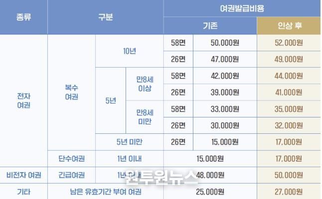 또한 1회 사용 가능한 단수여권은 15,000원에서 17,000원으로, 긴급한 사유로 발급되는 비전자여권인 긴급여권은 48,000원에서 50,000원으로 조정된다.