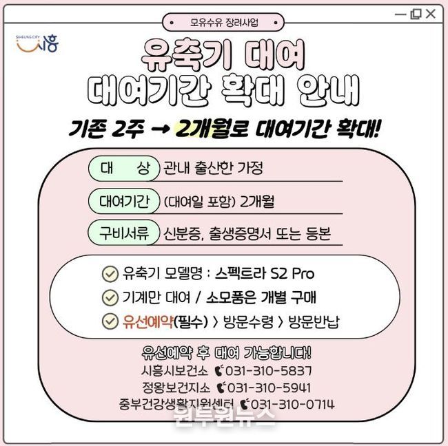 (원투원뉴스) 시흥시는 출산가정의 경제적 부담을 완화하고, 안정적인 모유수유 환경을 지원하기 위해 3월부터 유축기 대여 기간을 기존 2주에서 2개월로 확대 시행한다.