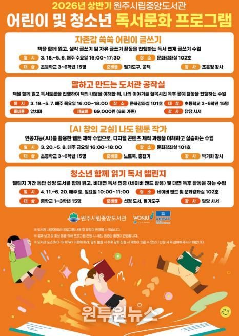 (원투원뉴스) 원주시립중앙도서관은 오는 3월부터 6월까지 ‘2026년 상반기 어린이 및 청소년 독서문화 프로그램’을 운영한다.