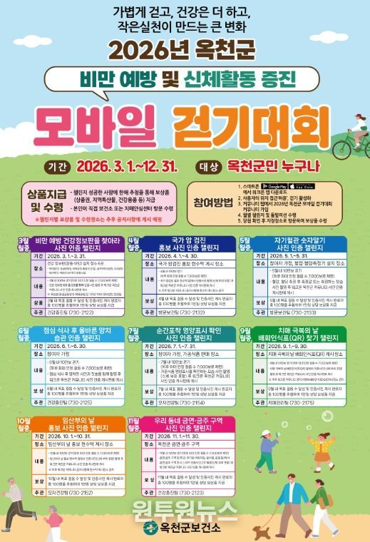 (원투원뉴스) 옥천군보건소는 지역주민의 일상 속 걷기 실천율을 높이고 건강증진을 도모하기 위해 ‘2026년 옥천군 모바일 걷기대회’ 커뮤니티를 운영한다고 밝혔다.