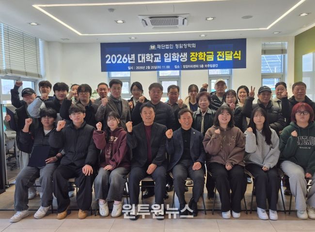 (원투원뉴스) (재)정암장학회는 25일 고한정암아리센터에서 2026년도 대학교 입학생들에게 4년제는 150만 원 2년제는 100만 원씩 ‘장학금’을 전달했다.
