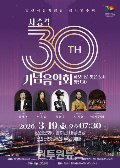 (원투원뉴스) 양산시는 오는 2026년 3월 19일 목요일 저녁 7시 30분부터 90분간 양산문화예술회관 대공연장에서 시 승격 30주년을 기념하는 양산시립합창단 정기연주회 ‘하모니로 빚은 도시 양산30’을 개최한다.