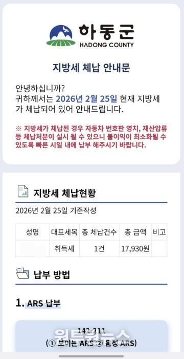 하동군은 “3월부터 체납자에게 카카오 알림톡이 발송될 예정이며, 카카오톡을 수신한 체납자는 안심하고 본인 인증 후 확인하면 된다”라고 전했다.