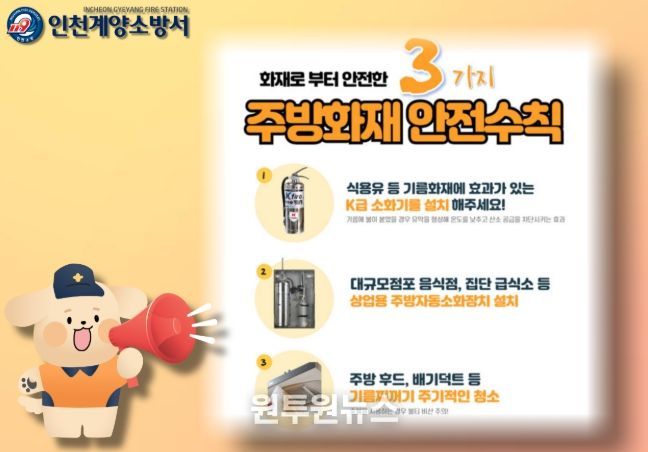 (원투원뉴스) 계양소방서는 음식점 주방에서 발생하는 후드·덕트 화재 예방을 위해 안전수칙 홍보에 나섰다고 27일 밝혔다.