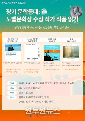 (원투원뉴스) 김포시 장기도서관은 인문학 프로그램 ‘장기 문학등대: 노벨문학상 수상 작가 작품 읽기’를 오는 4월 4일부터 4월 25일까지 매주 토요일 오후 2시에 장기도서관 문화교실2에서 운영한다고 밝혔다.