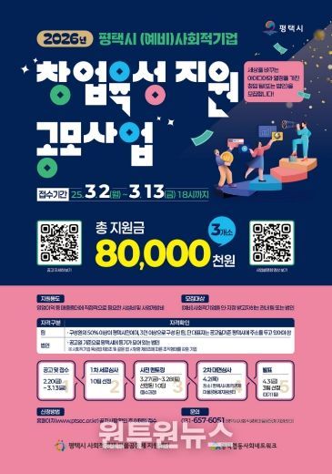 (원투원뉴스) 평택시는 참신한 아이디어와 열정을 가진 새로운 (예비)사회적기업을 발굴·육성하기 위한 ‘2026년 평택시 (예비)사회적기업 창업 육성 지원사업’을 공모한다고 밝혔다.