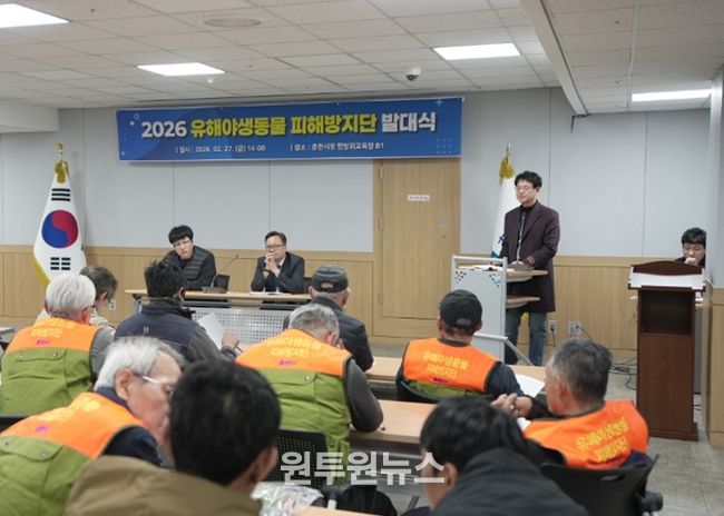 춘천시는 27일 시청 다목적회의실에서 2026년 유해야생동물 피해방지단 발대식을 열었다. 이날 발대식은 신규 위촉된 방지단과의 간담회를 비롯해 안전교육 홍보물을 배부했다.