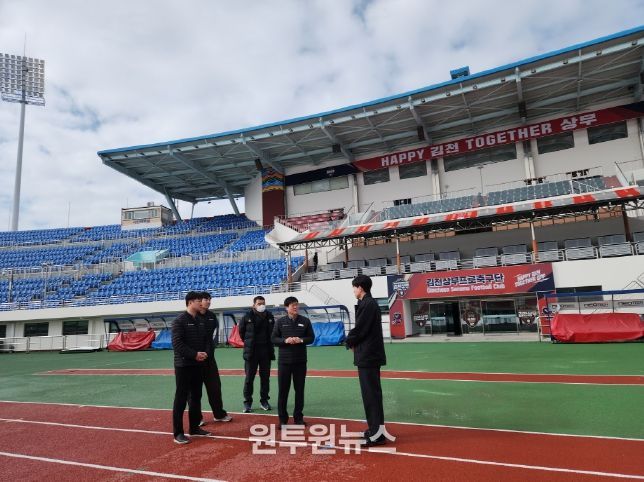 (원투원뉴스) 김천시시설관리공단은 프로축구‘2026 하나은행 K리그1 홈경기’개막이 임박한 가운데 지난 25일 시를 연고로 한 김천상무프로축구단의 홈구장인 김천종합운동장을 찾아 홈경기 준비 상황 전반을 점검하고 시민들이 함께 호흡하고 즐길 수 있는 쾌적한 공간조성을 위해 연일 방문을 이어가고 있다.
