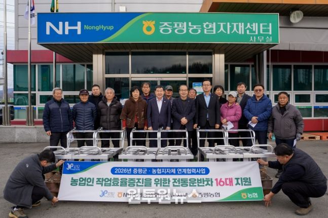 군은 지난 26일 증평농협 자재센터에서 ‘증평군-농협 지자체 협력사업 농기계(부추 동력운반차) 전달식’을 가졌다.