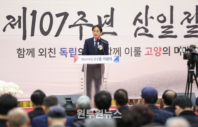 이동환 고양특례시장은 기념사를 통해 “3·1운동 107주년을 기념하는 뜻깊은 날에 함께해 주신 모든 분들께 감사드린다”며, "우리 선조들의 숭고한 정신이 여전히 우리의 가슴 속에 살아있으며, 오늘날 대한민국의 자유와 번영의 토대가 됐다”라고 서두를 뗐다.