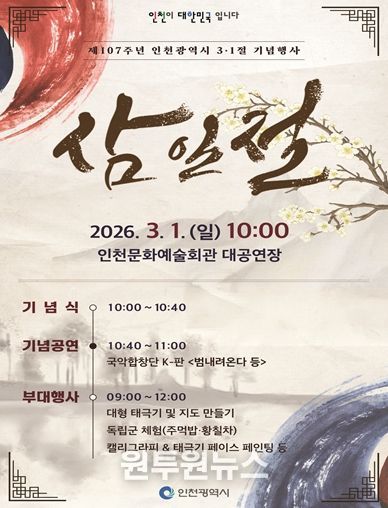 (원투원뉴스) 인천광역시는 3월 1일 오전 10시, 인천문화예술회관 대공연장에서 제107주년 3·1절 기념행사를 개최했다고 밝혔다.