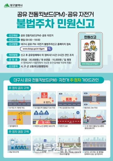 신고 방법은 대구시 홈페이지 ‘대구시 공유 PM·자전거 불법주차신고’ 메뉴에 접속해 공유 PM의 QR코드를 스캔, 신고 사진을 업로드하면 된다. 신고된 민원은 관할 구·군 및 공유 PM 업체에서 접수하며, 신고자는 모바일에서 실시간으로 처리 상황을 확인할 수 있다.