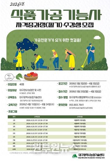 (원투원뉴스) 대구광역시농업기술센터는 3월 23일부터 4월 3일까지 ‘식품가공기능사 자격증과정 교육’ 수강생을 모집한다.