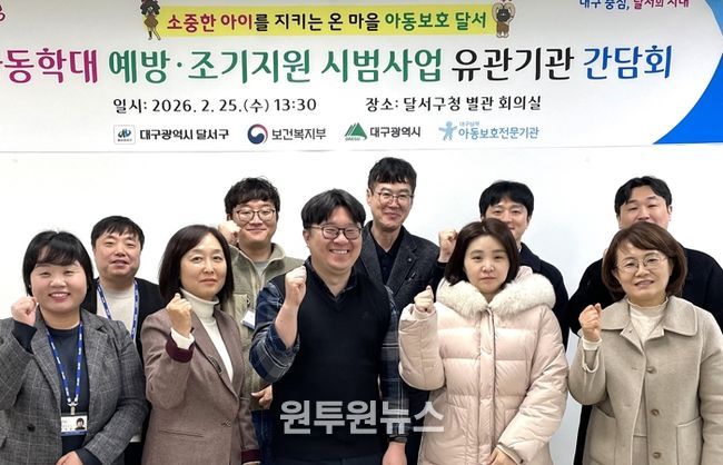(원투원뉴스) 대구 달서구는 지난 25일 구청에서 보건복지부, 대구시, 대구남부아동보호전문기관과 함께 ‘아동학대 예방·조기지원 시범사업 유관기관 간담회’를 개최했다.
