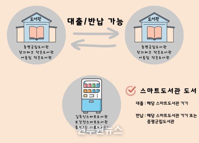 다만 스마트도서관 3곳(김득신·보강천·증평역)의 경우 무인 운영 시스템 특성상 해당 스마트도서관에서 대출한 도서는 해당 스마트도서관 또는 증평군립도서관에서만 반납이 가능하다.