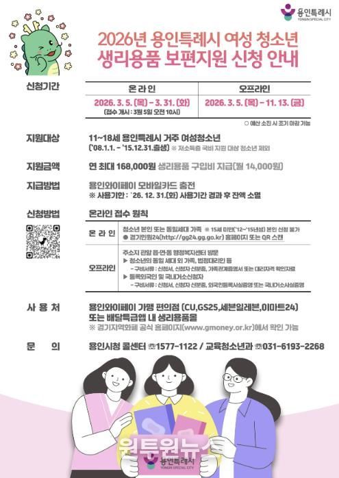 (원투원뉴스) 용인특례시는 5일부터 31일까지 여성 청소년 생리용품 보편지원사업 신청을 받는다고 3일 밝혔다.