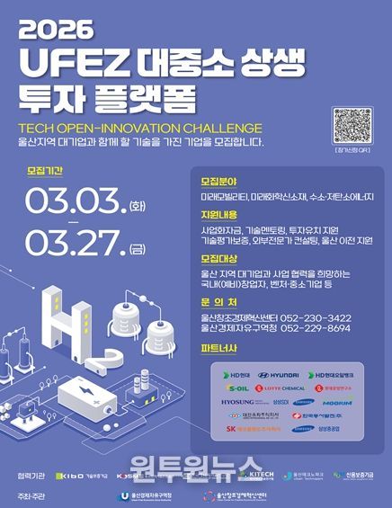 (원투원뉴스) 울산경제자유구역청은 ‘2026년 울산경제자유구역(UFEZ) 대중소 상생투자 기반(플랫폼) 공모전’을 개최한다고 밝혔다.