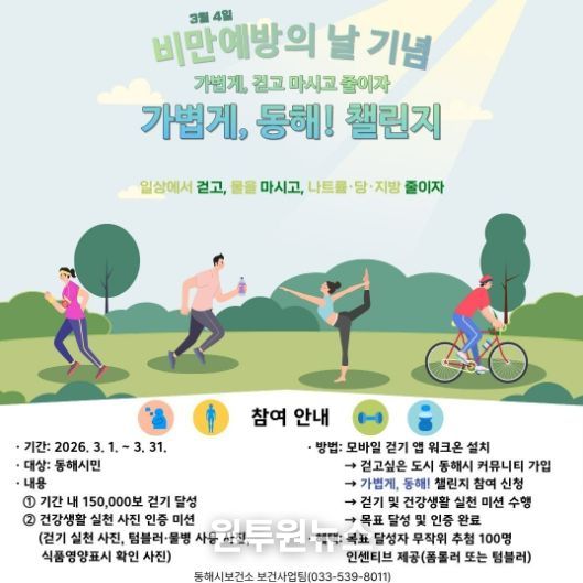 (원투원뉴스) 동해시가 3월 4일 ‘비만예방의 날’을 맞아 시민 건강생활 실천을 유도하고 비만 예방 인식을 높이기 위해 3월 한 달간 모바일 걷기 챌린지 등 참여형 건강 캠페인을 추진한다.