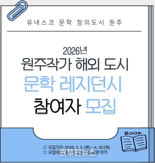 (원투원뉴스) 유네스코 문학 창의도시인 원주시는 지역 문학인의 창작활동 지원과 국제 교류 확대를 위해 ‘원주작가 해외 도시 문학 레지던시’ 참여 희망 작가를 4월 30일까지 모집한다.