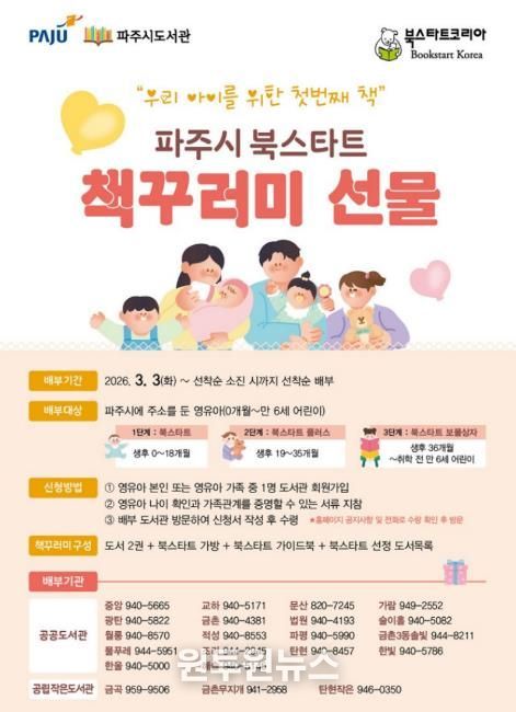 배부 대상은 파주시에 주민등록이 되어 있는 0개월부터 취학 전까지의 영유아와 부모로, 가족 중 1인이 도서관 회원이어야 한다. 연령·거주지·가족관계를 확인할 수 있는 서류를 지참해 관내 도서관을 방문하면 선착순으로 수령할 수 있다.