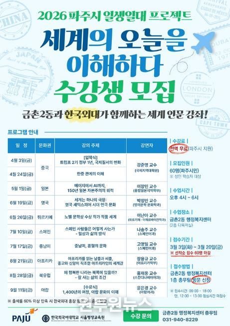 (원투원뉴스) 파주시 금촌2동은 한국외국어대학교와 협력해 국제 정세와 세계의 논쟁거리를 조망하는 인문 강좌 ‘세계의 오늘을 이해하다’를 개설하고, 녪년 금촌2동-한국외대 일생일대 프로젝트’를 본격 추진한다.