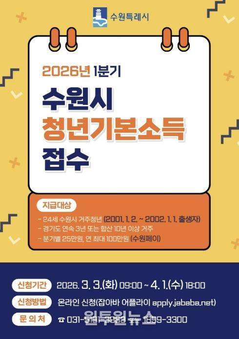 (원투원뉴스) 수원특례시가 3월 3일 오전 9시부터 4월 1일 오후 6시까지 24세 청년을 대상으로 ‘2026년 1분기 청년기본소득’ 신청을 받는다.