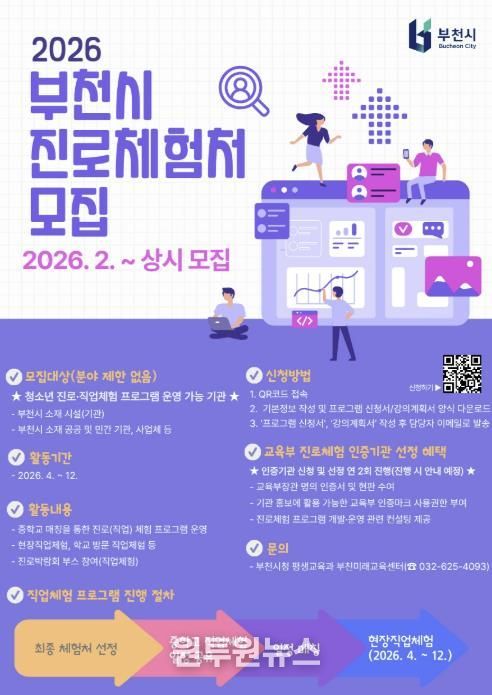 (원투원뉴스) 부천시는 관내 중학생들에게 생생한 직업 현장 경험을 제공하고 올바른 직업관 형성을 지원하기 위해 ‘2026년 직업체험 프로그램’을 함께 운영할 진로 체험처를 모집한다.