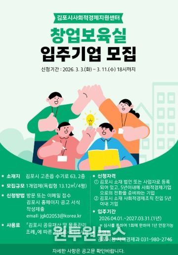 (원투원뉴스) 김포시는 사회적 가치를 실현하는 초기 사회적경제기업의 안정적인 운영 및 성장을 지원하기 위해 오는 3월 3일부터 11일까지 사회적경제지원센터 창업보육실 입주기업을 모집한다.