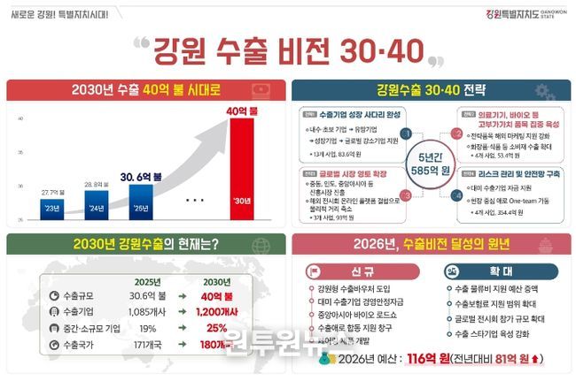 이어 발표한 ‘강원수출 미래비전 30‧40’은 2026년을 수출 제2도약의 원년으로 삼아 2030년까지 수출 40억 달러 달성을 목표로 하는 중장기 전략이다.