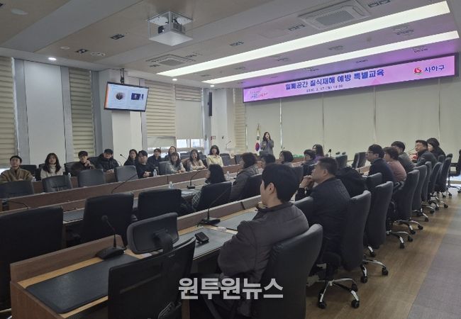 (원투원뉴스) 부산 사하구는 지난 2월 27일 사하구청 재난안전상황실에서 한국산업안전보건공단 부산광역본부 산업보건부장 박현희 강사를 초빙해 밀폐공간 담당 직원을 대상으로 ‘밀폐공간 질식재해 예방 특별교육’을 실시했다.