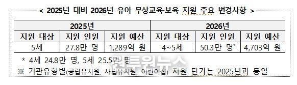 (원투원뉴스) 교육부는 2026년부터 유아 무상교육·보육 지원 대상을 4~5세로 확대한다.
