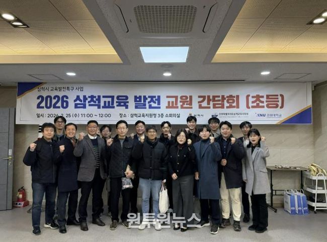 (원투원뉴스) 삼척시 교육발전특구 사업의 일환으로 실시한 ‘2026 삼척 교육발전 교원 간담회’가 지난 2월 25일 삼척교육지원청에서 관내 유·초·중·고교 교원 70여 명이 참여한 가운데 성황리에 개최됐다. 이번 간담회는 3월 신학기부터 시행되는 3차년도 주요 사업을 학교 현장과 긴밀히 공유하고, 실질적인 협력 방안을 모색하기 위해 마련됐다.