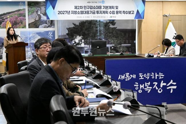 (원투원뉴스) 장수군은 3일 군청 2층 회의실에서 지역소멸에 선제적으로 대응하기 위한 '제2차 인구감소지역대응 기본계획 및 2027년 지방소멸대응기금 투자계획 수립 용역' 착수보고회를 개최했다.