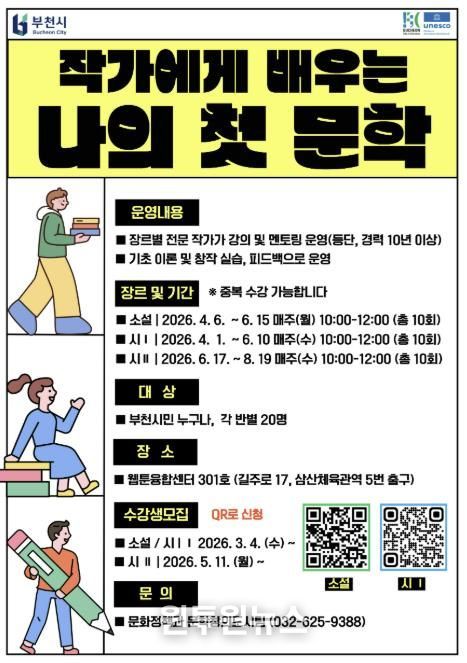 교육은 웹툰융합센터 301호에서 진행되며, 부천시민을 대상으로 반별 20명을 선착순 모집한다. 1기 소설과 시 과정 신청은 3월 9일부터, 2기 시 과정 신청은 5월 11일부터다.