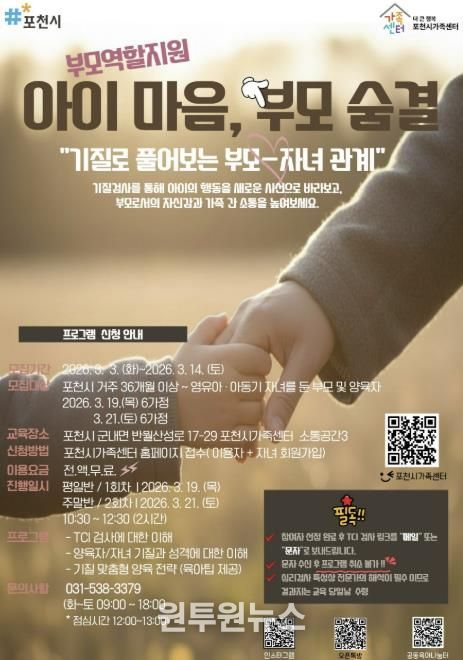 (원투원뉴스) 포천시 ‘더 큰 행복 포천시가족센터’는 부모와 자녀의 기질을 이해하고 건강한 가족관계 형성을 지원하기 위해 부모-자녀 기질 검사 프로그램인 ‘아이 마음, 부모 숨결’을 오는 3월 19일과 21일 이틀간 운영한다.
