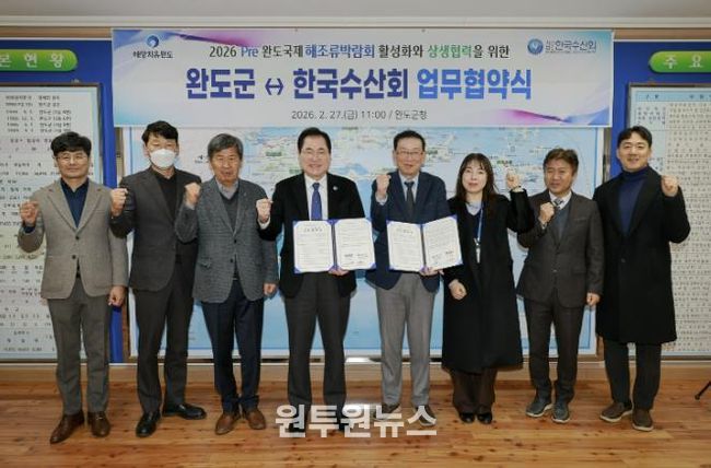 (원투원뉴스) 완도군은 지난 2월 27일 완도군청에서 신우철 완도군수와 정영훈 (사)한국수산회 회장 등이 참석한 가운데 2026 Pre완도국제해조류박람회 성공 개최와 상호 협력을 위한 업무 협약을 체결했다.