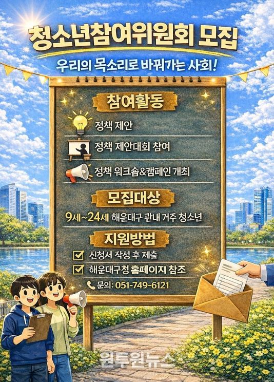 (원투원뉴스) 해운대구는 관내 거주 및 소재 학교에 재학 중인 9세~24세 청소년을 대상으로 ‘청소년참여위원회(13기)’ 위원을 이달 20일까지 공개 모집한다.