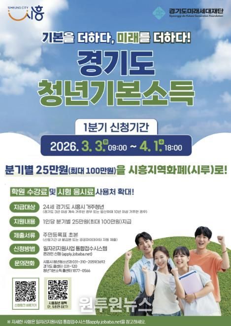 (원투원뉴스) 시흥시는 청년의 사회적 기본권 보장과 지역경제 활성화를 위해 4월 1일까지 ‘2026년 1분기 청년기본소득’ 지급 신청을 받는다.