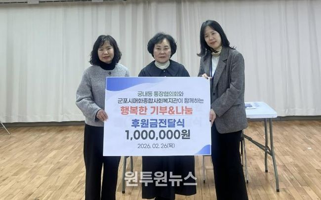 (원투원뉴스) 군포시 궁내동통장협의회는 지난 2월 26일 매화종합사회복지관에 후원금 100만원을 전달했다.