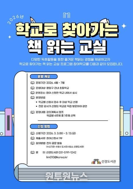 (원투원뉴스) 수원시 선경도서관은 ‘2026년 학교로 찾아가는 책 읽는 교실’에 참여할 팔달구 관내 초등학교를 13일까지 모집한다.